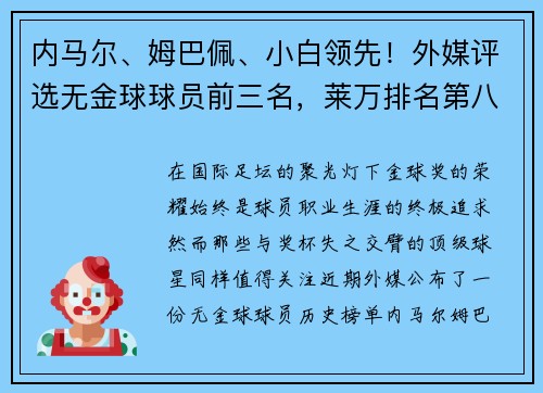在国际足坛的聚光灯下,金球奖的荣耀始终是球员职业生涯的终极追求。然而,那些与奖杯失之交臂的顶级球星同样值得关注。近期,外媒公布了一份“无金球球员”历史榜单,内马尔、姆巴佩、伊涅斯塔占据前三,莱万意...