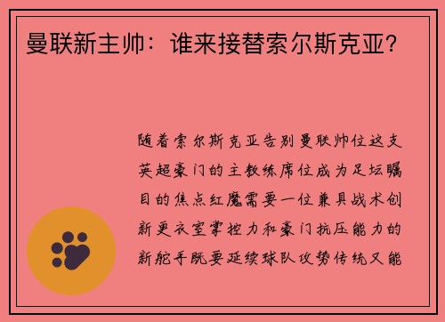 随着索尔斯克亚告别曼联帅位,这支英超豪门的主教练席位成为足坛瞩目的焦点。红魔需要一位兼具战术创新、更衣室掌控力和豪门抗压能力的新舵手,既要延续球队攻势传统,又能重建防守体系。从本土少壮派到大牌外籍...