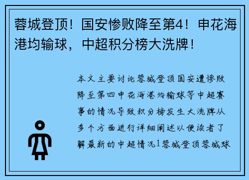 本文主要讨论蓉城登顶、国安遭惨败降至第四、申花海港均输球等中超赛事的情况,导致积分榜发生大洗牌。从多个方面进行详细阐述,以便读者了解最新的中超情况。 1、蓉城登顶 蓉城球队在最新一轮比赛中表现出色,...